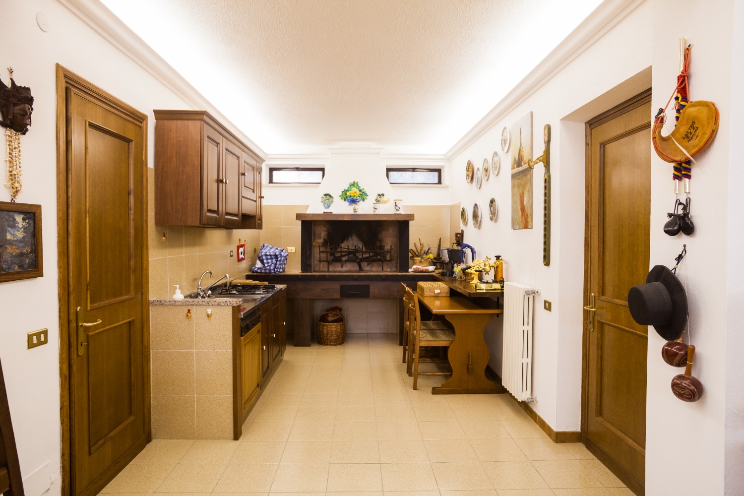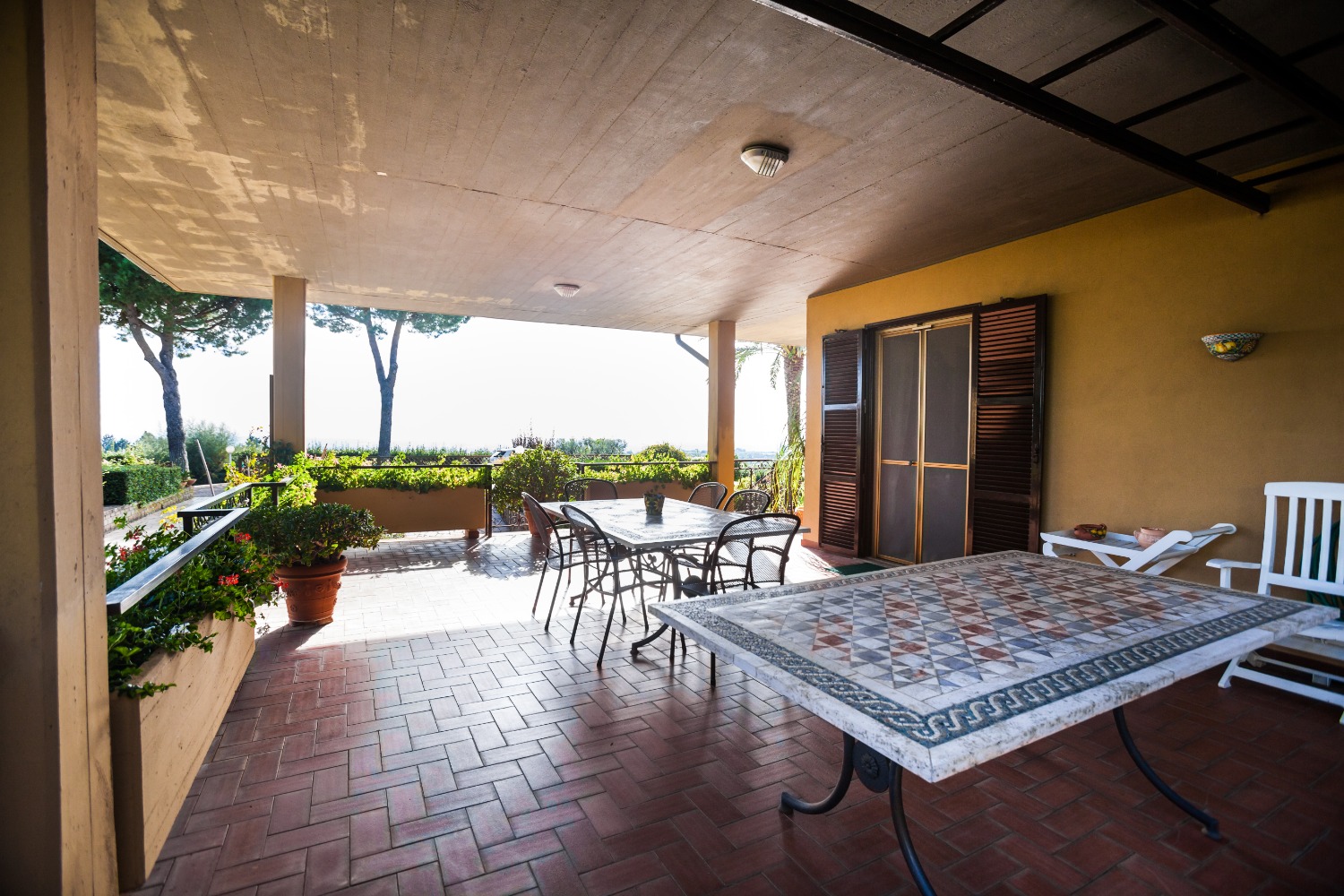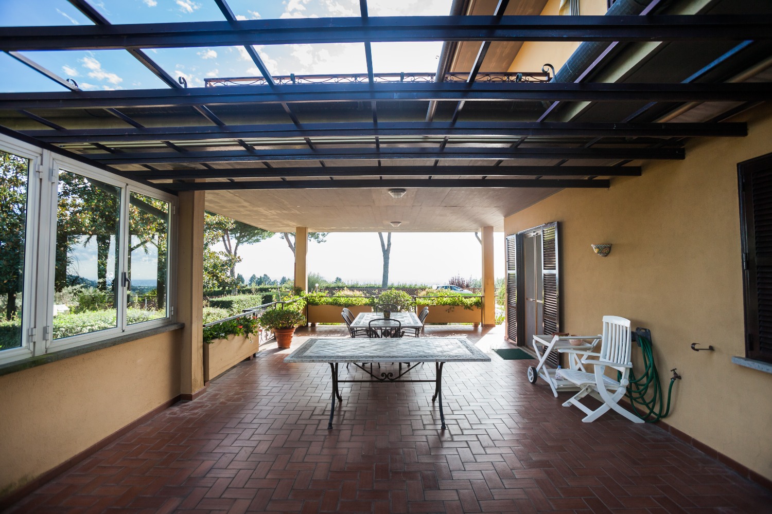 Whilst walking along the garden, apart from enjoying an exceptional view extending from all the surrounding valley including the Thyrrhenian Sea, from Torvaianica to Mount Circeo, to the Pontine islands, you can enjoy a both tennis and/or five-a-side football court with night illumination. At the moment there is no swimming pool. Nevertless there is an arrangement with the already assigned space, including the water pump. Besides we can find a covered area, equipped with a perfectly working kitchen, as well as a chimney, and an oven to make pizzas and barbecue.