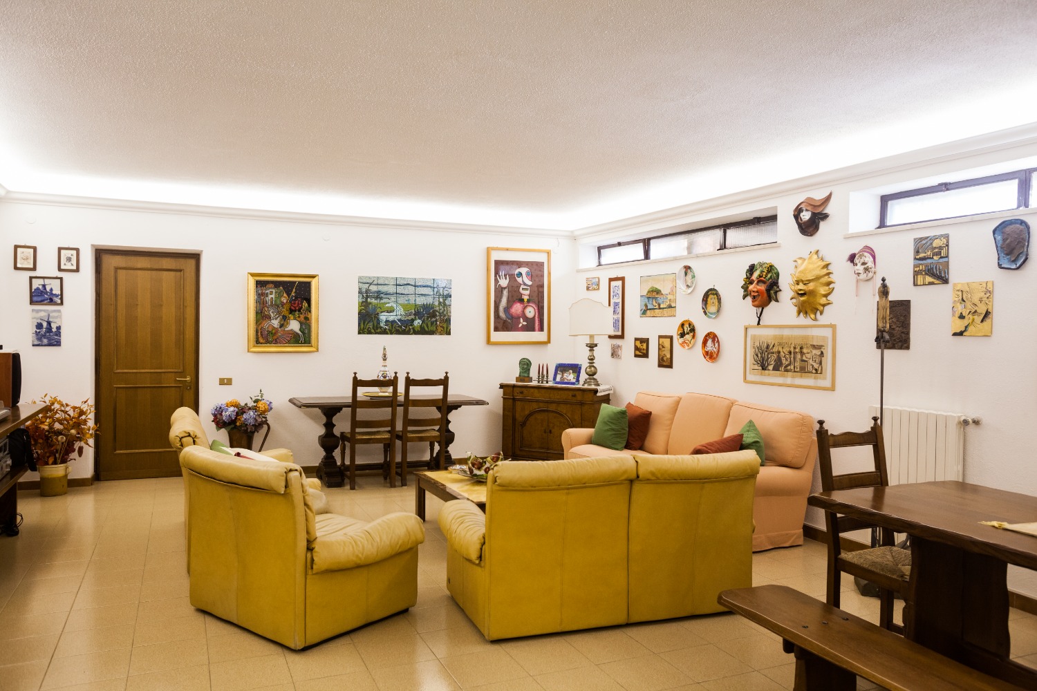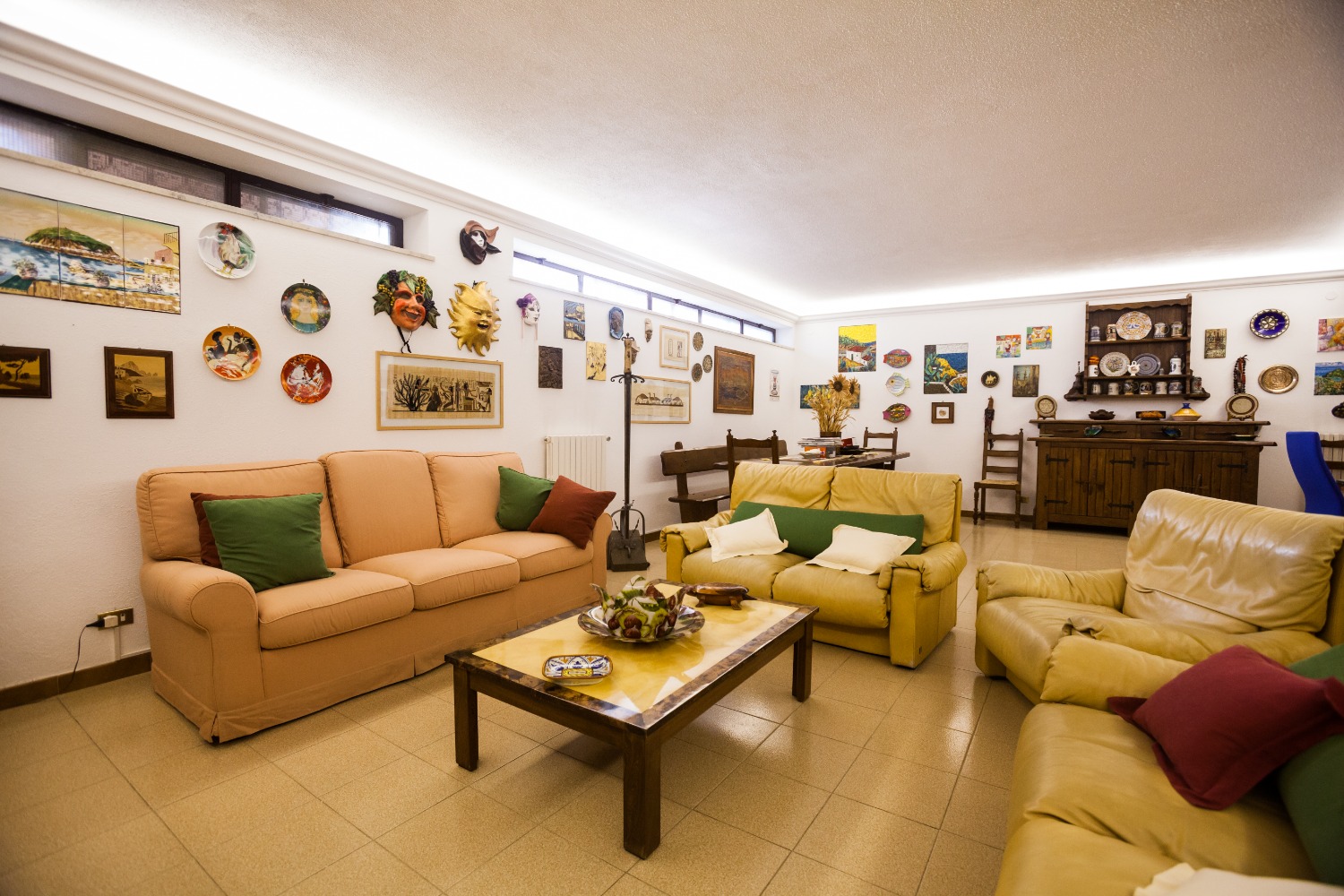 Il piano seminterrato, completamente asciutto grazie ad una ampia intercapedine, è invece occupato prevalentemente dalla taverna con cucina e camino, ideale per la convivialità della famiglia nelle stagioni più fredde, la cantina, il magazzino per i mobili da giardino, il garage per otto posti auto e un bagno.