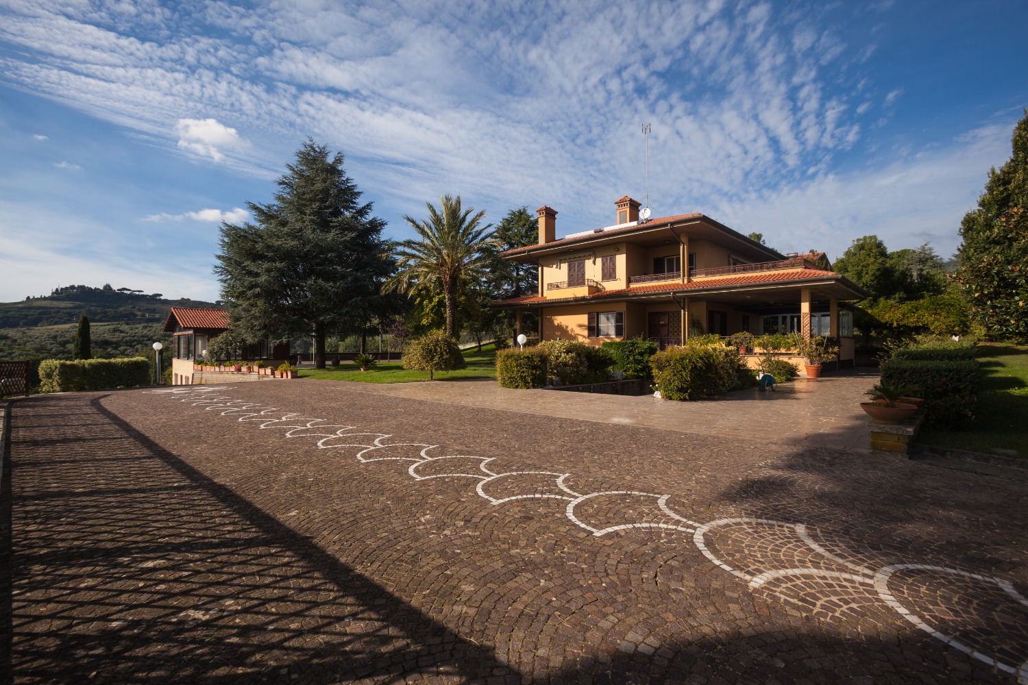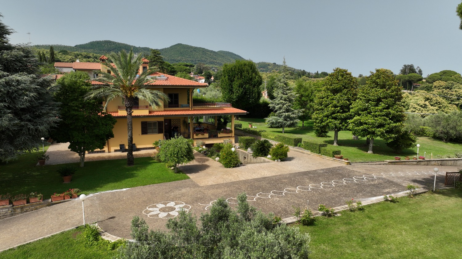 Once you cross the gate, which assures a complete privacy, you will enjoy an extraordinary beauty vision: you are immediately welcomed by an extremely well-kept 7,000 sqm green lawn garden, (the lawn is cared for daily by the caretaker who at the moment lives next to the property), including more than thirty majestic trees which, with their secular shade, create some unique shady corners.
